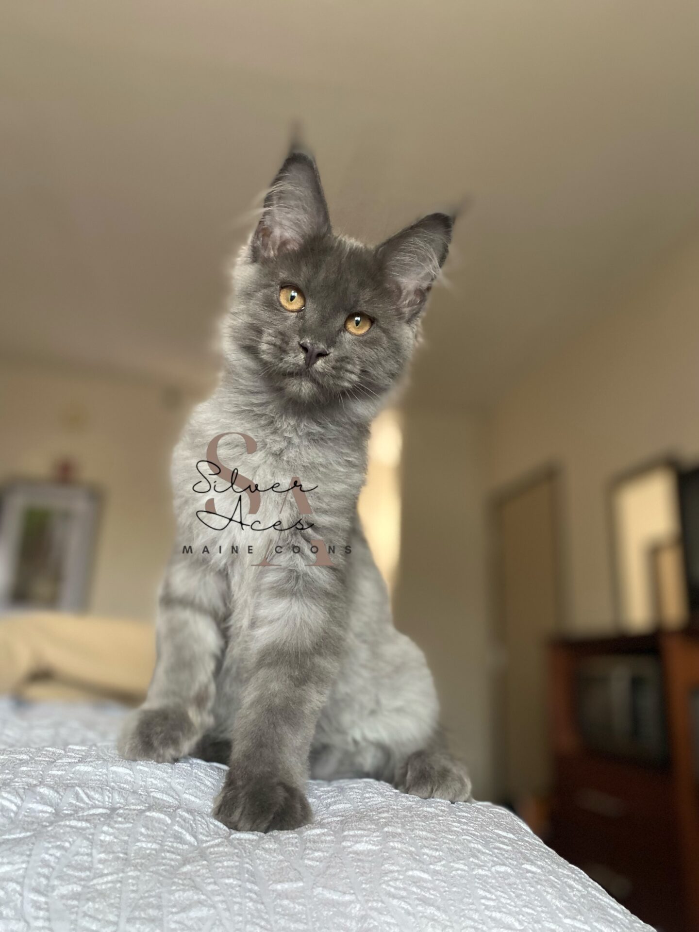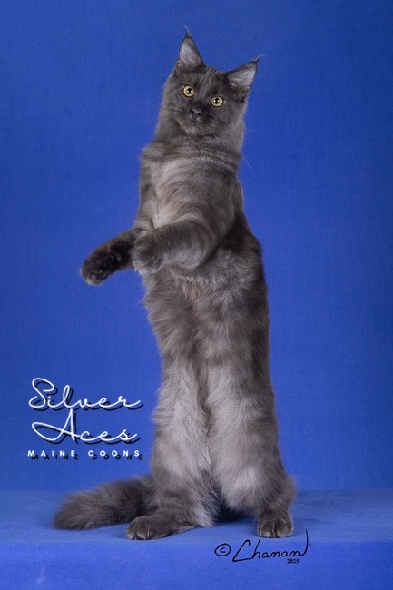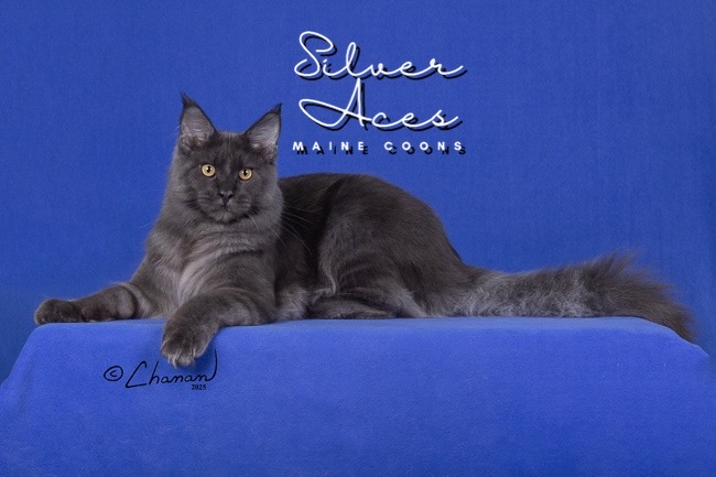 Silver Ace Maine Coons is proud to introduce Ace, our resident king of our Texas based cattery. Ace carries both prominent attributes and strong disposition. He is a very confident male that has a cool, calm demeanor. We love his blue smoke coloring and handsome facial features. He is quite the head turner for sure! We look forward to seeing his unique traits shining thru to the future litters of kittens.