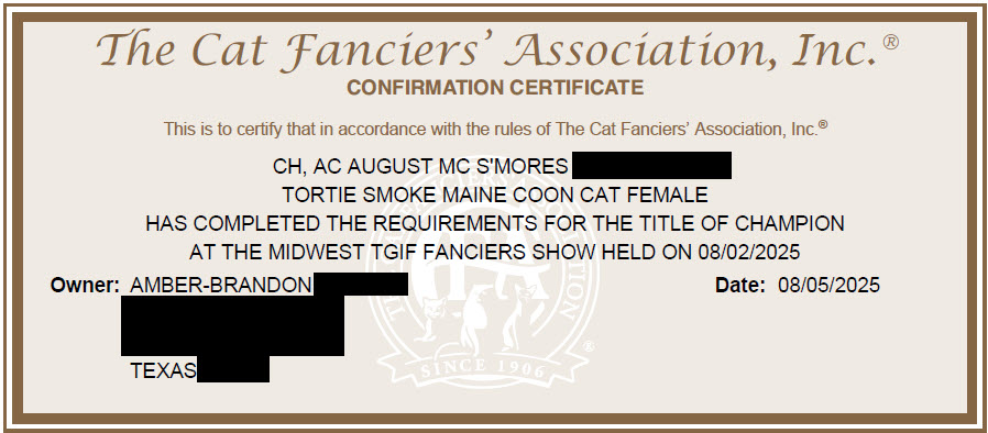 Being spunky and playful she is sure to put a smile on your face. S’mores also earned her CFA Championship Title in July 2025.
